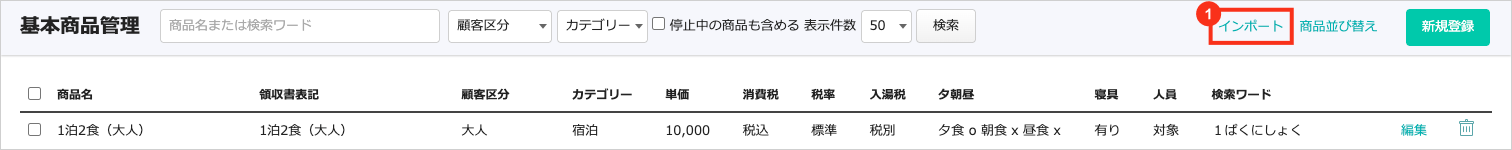 ・カテゴリー:登録されている「カテゴリー名」のみ入力可能(参照:マスタ設定 > 商品設定 > 基本商品カテゴリー管理 の「名前」)