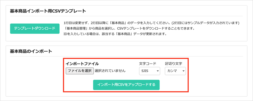 インポート画面でCSVファイルを選択し、「文字コード」「区切り文字」を選択して「インポート用CSVをアップロードする」ボタンをクリックします。