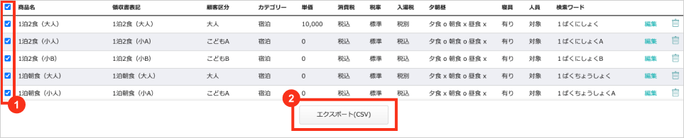②チェックを入れると画面下部に「エクスポート(CSV)」ボタンが表示されます。ボタンをクリックするとチェックしたデータを含むCSVファイルを取得できます。
