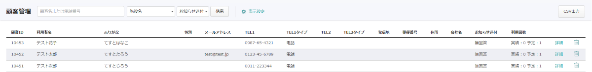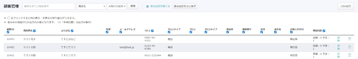 なお顧客管理画面およびCSV出力では、並び替え機能はご利用いただけません。