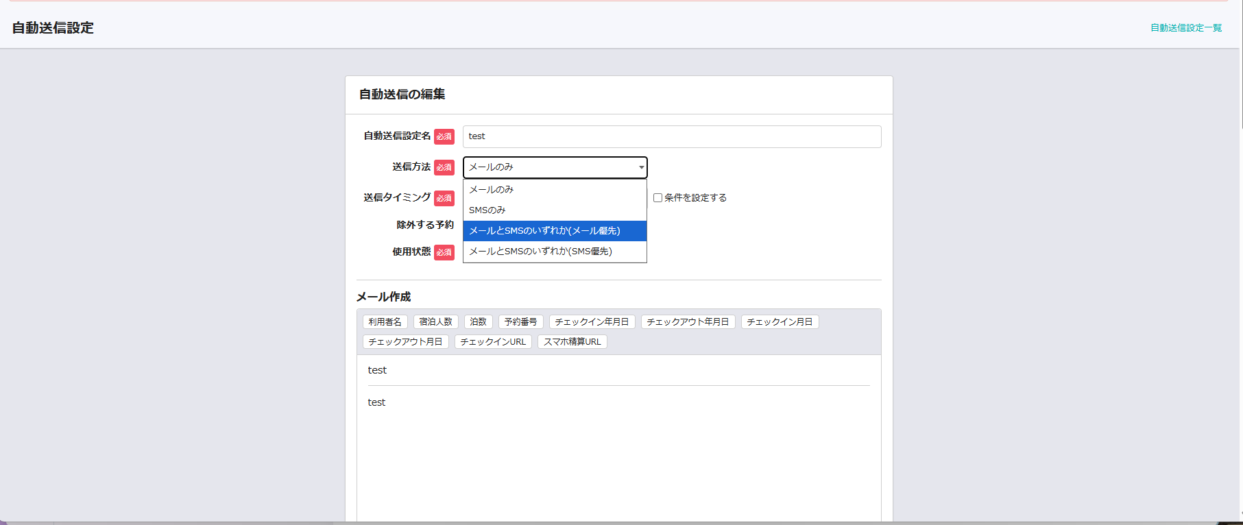 以下の設定を行うことで、自社HPや他のOTA(じゃらん等)にはメールで、楽天トラベルにはSMSで、といった「送り分け」が自動で行われます。