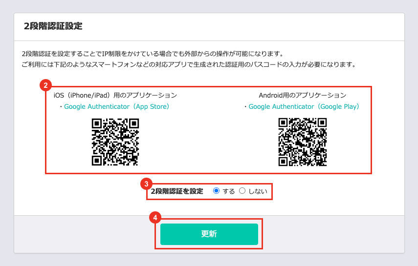 ②設定が許可されたユーザーは、「2段階認証設定」画面から設定が行なえます。