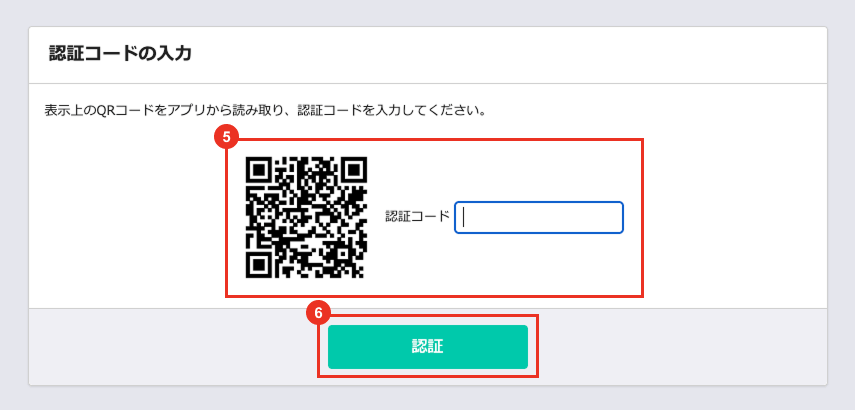 ⑤「認証コードの入力」画面に進むので、認証用アプリでQRコードを読み込み、「認証コード」欄にアプリで表示された数字を入力します。