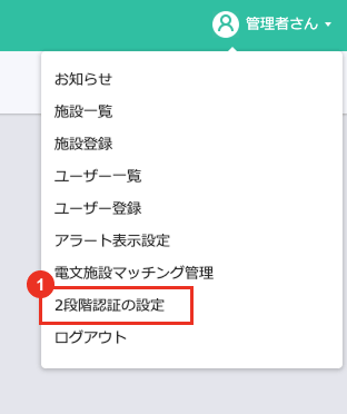 ①許可されたユーザーの右上メニューに「2段階認証の設定」が表示されます。許可されたユーザーは「2段階認証の設定」ページにアクセスします。