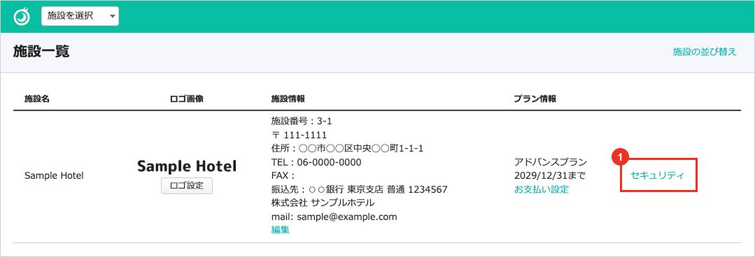 ①右上メニューから「施設一覧」にアクセスします。施設一覧より設定したい施設の「セキュリティ」をクリックします。