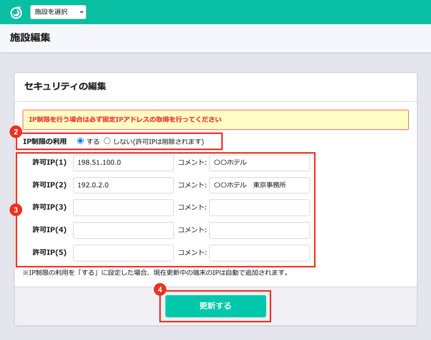③「許可IP」欄にIPアドレスを入力します。コメントには施設名など、許可IPに関するメモを入力します。(上記画像の数字はサンプルです。)
