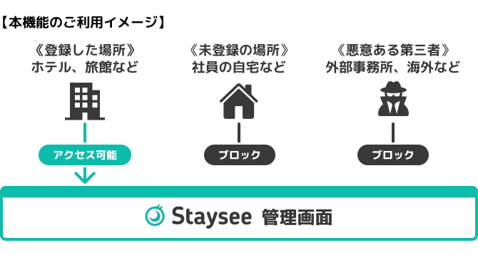 あらかじめ「ログインできる場所(例:ホテルのフロント、本部の事務所)」を登録しておくと、登録していない場所(例:悪意ある人物がいる場所、社員の自宅、海外など)からは一切ログインできなくなります。