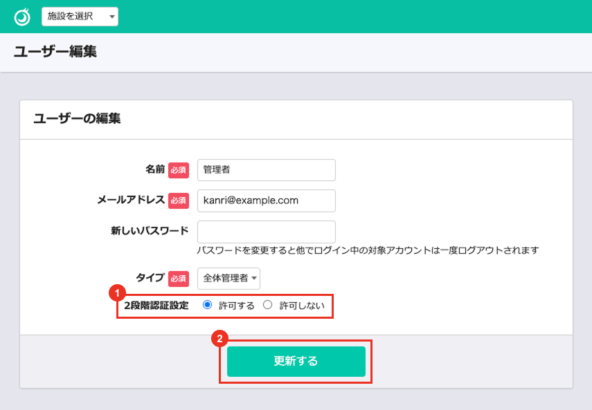 ①全体管理者が、右上メニューから「ユーザー一覧」にアクセスし、2段階認証を設定したい「ユーザーの編集」画面を開き、「2段階認証設定」を「許可する」に変更します。